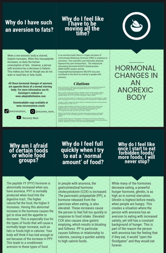 It is important as a sufferer or family member of someone with anorexia to understand the evolutionary and genetic component of anorexia as well as all of the changes that occur in one’s body due to this evolutionary adaptation we call anorexia. People with anorexia are not looking to be thin, they aren’t angry at their families, they did not develop this as a way to control their environment. They have an evolutionary adaptation that once would have saved their families lives. At one point in our history anorexia was a positive, not a negative. To untangle oneself from this adaptation and stop the need to migrate one must first understand where it came from.